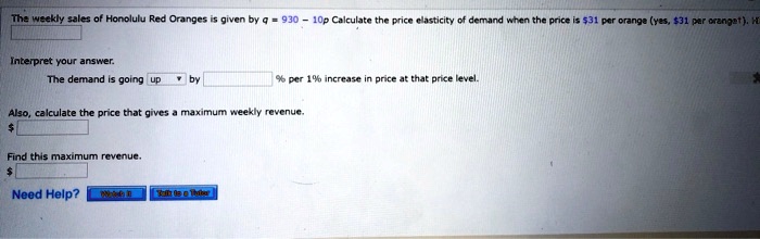 Solved Weckly Lane Honolule Oranoet Oivcn Dy 10p Calculate The Price Clasticity Demund Nen The Pricer 31per Prange Crenat E Inberoret You Angwer Demand Going 105 Increase Tnat Drce Calculate The Cot Qnvc